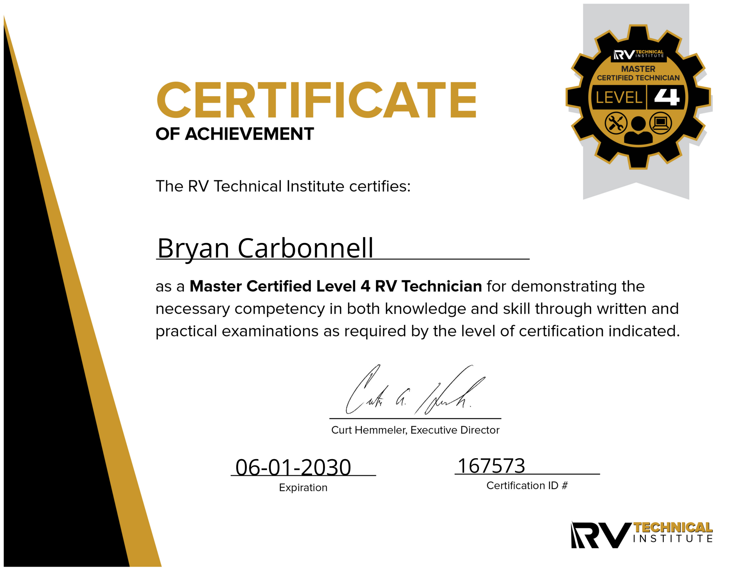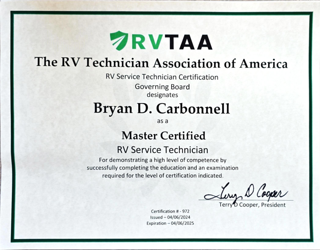 Bryan didn’t stop at his NRVIA certification. He kept learning, earning his Master Certified RV Technician credentials through RVTI and RVTAA. Eventually, he joined the National RV Training Academy (NRVTA) in Athens, TX, as an instructor, teaching the next generation of RV inspectors and technicians.